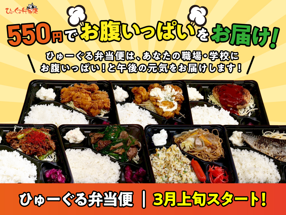 お待たせいたしました。3月の1周年に合わせ、HGMは「午後の元気をチャージする」ためのデリバリーサービス、「ひゅーぐる弁当便」を正式にリリースいたします。