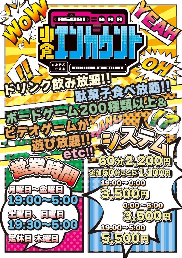 カウンターでしっぽり飲むも良し、ゲームを囲んで盛り上がるも良し。ゲームもお酒も、そして駄菓子も愛するあなたに贈る、小倉の“異世界系”アソビ空間!持ち込みプレイもOKで、遊び方は自由自在。今日の“エンカウント”が、きっと忘れられない夜になります!