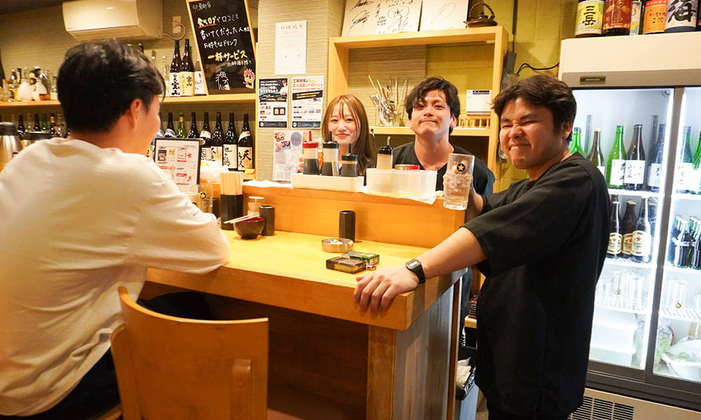 「焼鳥39魚町店」では、スタッフとお客さんが一緒にお酒を楽しむことも。